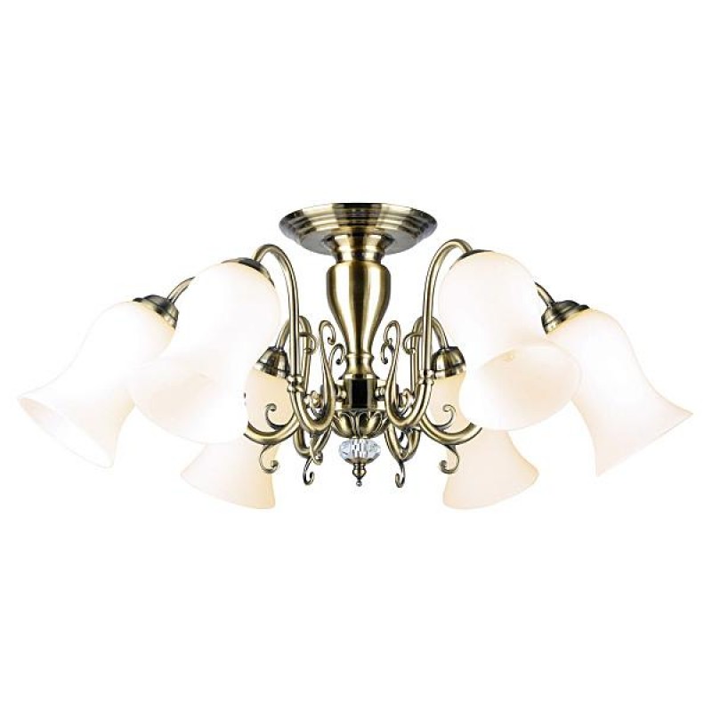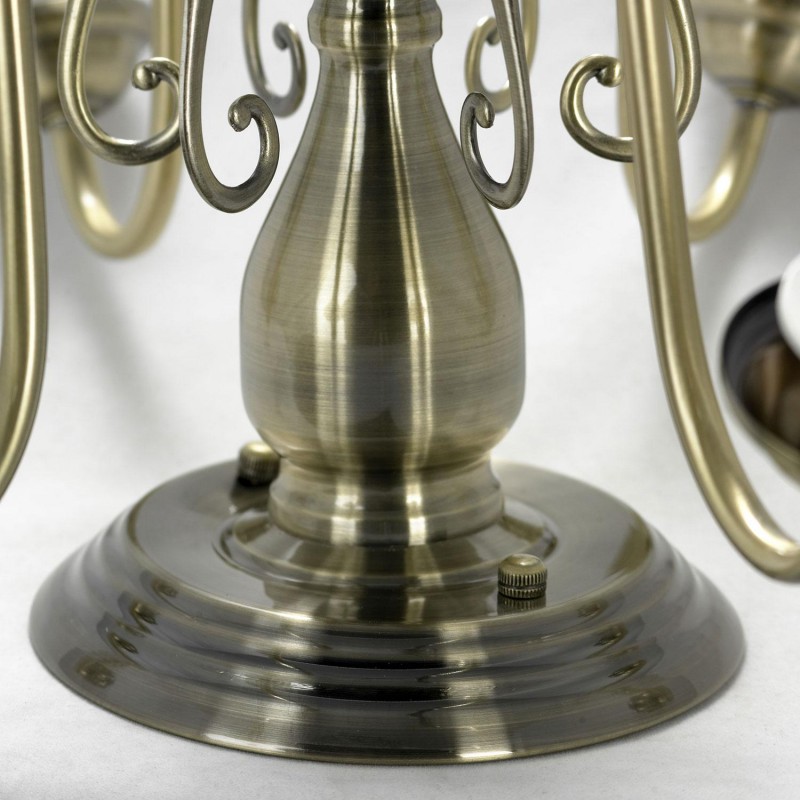 Шесть повернутых вниз плафонов из матового стекла, надежно закреплены на арматуре бронзового цвета. В нижней части центральной оси вставка из прозрачного материала придает роскошь изделию.
