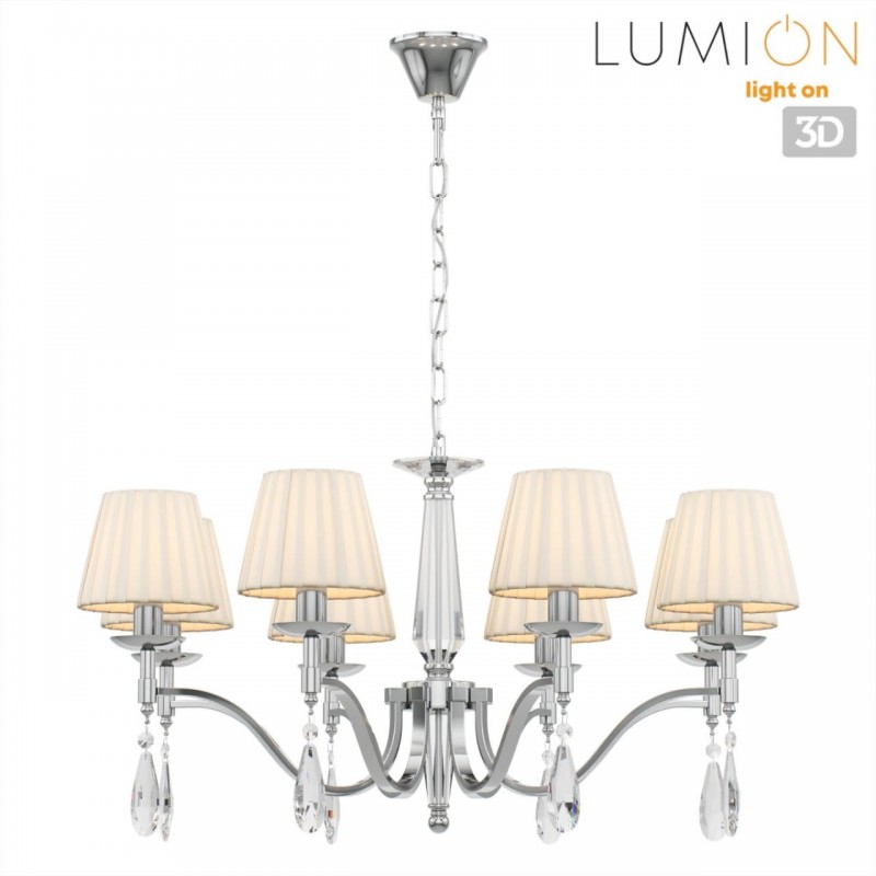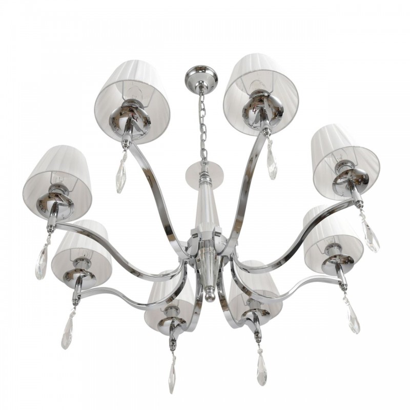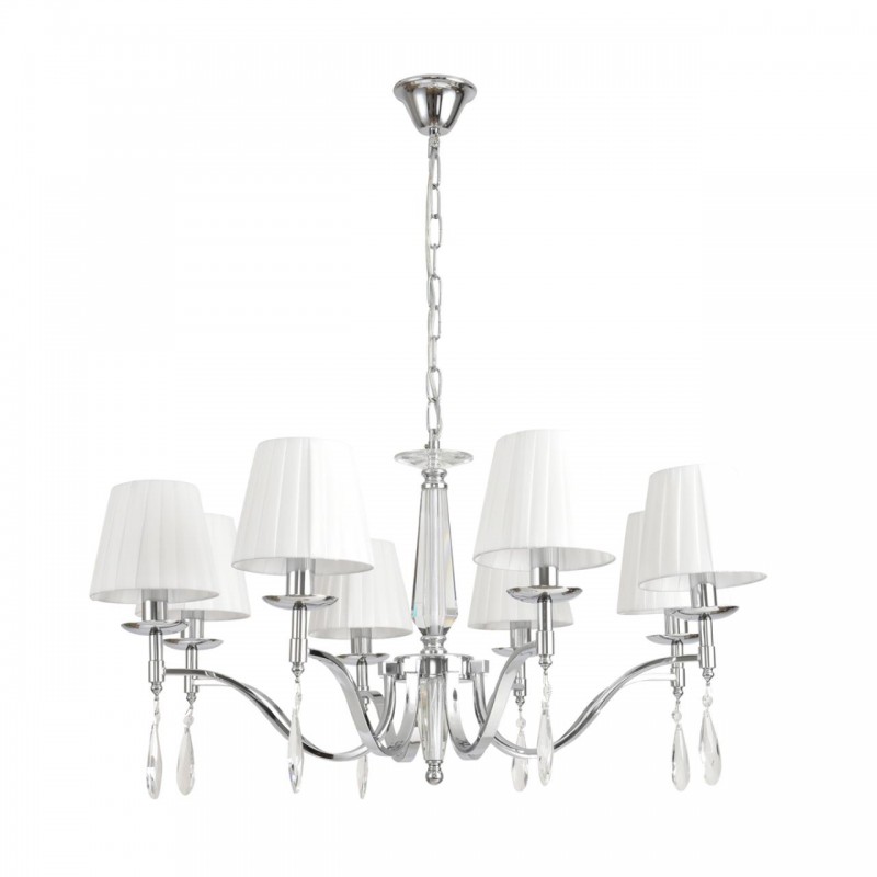 Торжественная модель MAGDA достойна вашего восхищения. Центральный декоративный элемент, изготовленный из чистейшего хрусталя, привлекает соим великолепием. Крупные хрустальные подвески преломляют свет и горят мириадами разноцветных искр. Высокие подсвечники, увенчанные традиционными классическими белыми абажурами, добавляют модели торжественности и статусности.