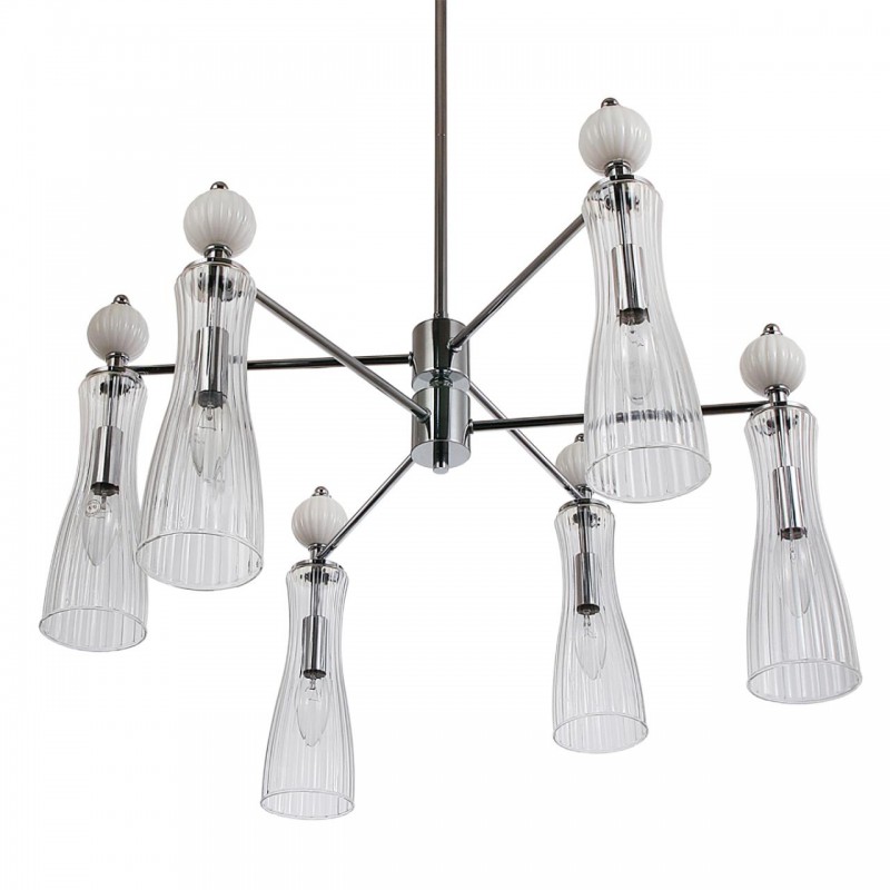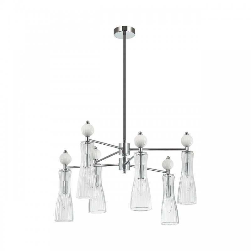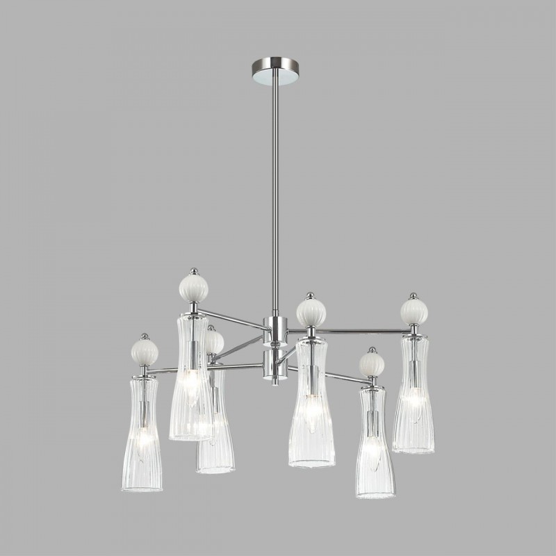 Легкая и изящная серия EMILY декорирована белыми керамическими элементами. Линии - тренд в современном дизайне - они повторяются на стеклянных плафонах и шариках. Хромированные элементы арматуры тонкие и практически растворяются в интерьере. Серия содержит люстры на 6 и 8 рожков, бра с выключателем, подвес на 1 лампу с возможностью регулировки по высоте.