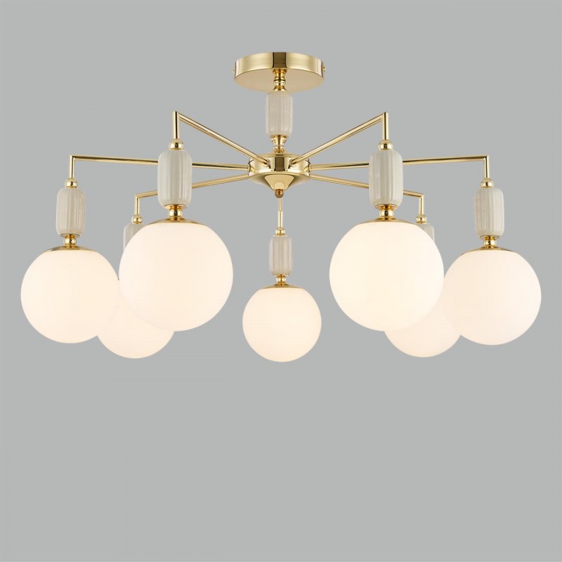 Линия светильников VIVIEN воплощает в себе элегантность и утонченность. Серия идеальна для оформления гостиной, спальни или кабинета в классическом стиле. Арматура светильников изготовлена из металла и керамики, что придает им особый аристократический вид, а плафоны из белого стекла мягко рассеивают свет. Цвет арматуры - французское золото, дополненное серо-бежевыми керамическими элементами.Потолочные светильники имеют изящный каркас с грациозными рожками. Светильник на 5 ламп подойдет для небольших помещений, в то время как модели на 7 и 9 ламп создают яркое освещение для более просторных комнат. Серия VIVIEN представлена также настольной лампой и настенным бра, которые станут комфортным дополнением в спальнях и кабинетах. Настольная лампа имеет тяжелое каменное основание под мрамор, что обеспечивает ей устойчивость.