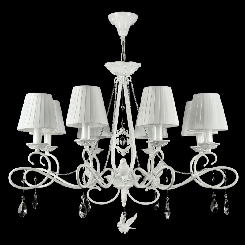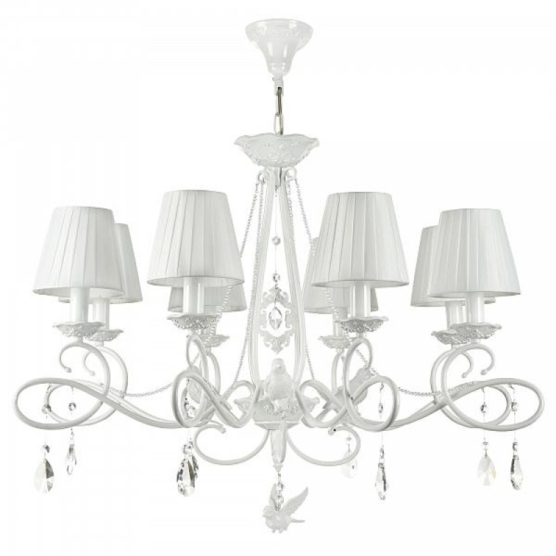 Арматура из металла, цвет – жемчужный белый. Абажуры из плиссированной органзы белого оттенка. Декор – подвески из кристаллов, фигурки птиц. Высота люстр регулируется.