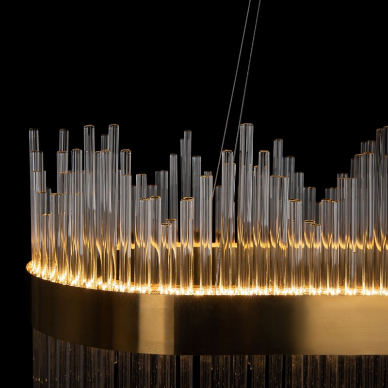 Современный дизайн часто вдохновляется природными формами, а серия Chalice повторяет одну из них, формируя облик струящегося водопада света. Симметрично расположенный декор создает динамичный рисунок переливающихся волн, а лучи света, преломляясь в стеклянной поверхности, подчеркивают иллюзию движения. Металлическая арматура окрашена в золотой оттенок, который легко интегрируется как в современные, так и в классические обстановки. Визуально незаметные тросы поддерживают идею невесомости композиции, а LED-источники света обеспечивают яркое освещение. Три подвесные люстры различного диаметра и мощности позволяют выбрать оптимальный вариант с учетом размеров помещения. Серия займет достойное место в гостиных, помещениях HoReCa, выполненных в стиле ар-деко, модерн, неоклассика, эклектика.