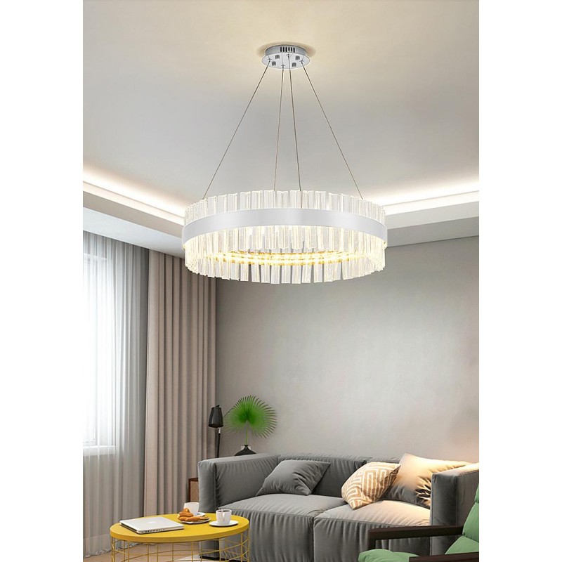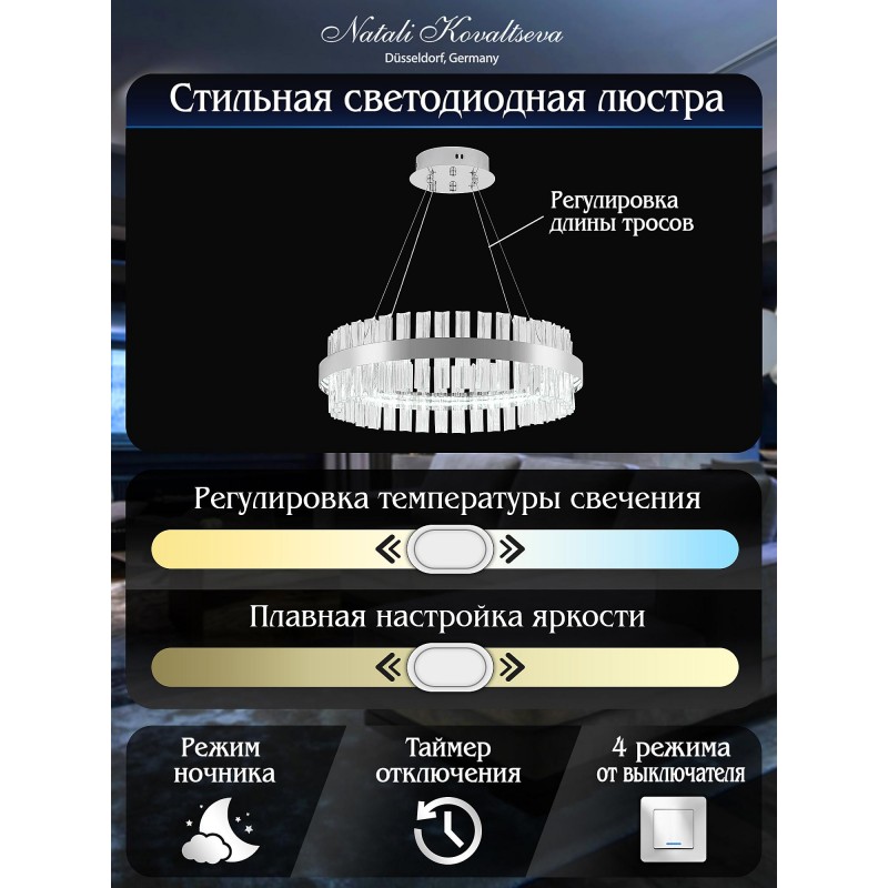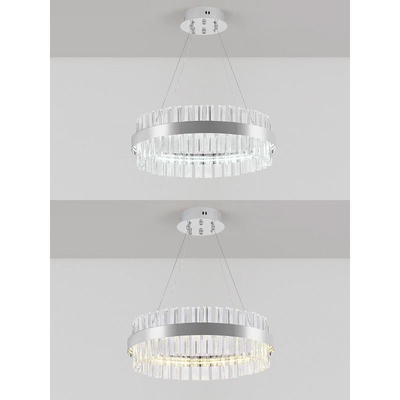 Светодиодная люстра высокого качества в современном стиле с функционалом "умный дом" По периметру с двух сторон располагается гранённый хрусталь, благодаря которому светильник подойдёт в любой интерьер. Высота люстры регулируется. Многофункциональный пульт управления позволит дистанционно управлять светильником. Возможность управлять светильником со смартфона и планшета, загрузив специальное приложение. Люстра в качестве основного освещения имеет тёплый, естественный и холодный свет с регулировкой температуры свечения. Несколько режимов их интеграции. Кроме того, имеется функция регулировки яркости свечения, делая светильник оптимальным в процессе использования. Имеет режим ночника и таймер отключения. Общая мощность лампы 100 Ватт. Потолочный светодиодный светильник может осветить до 18 метров2. Он прост в сборке, установке и экономичен в обслуживании. Подойдёт для всех видов потолков. Степень защиты 20 IP. Светодиодные ленты и платы легко заменимы в случае перегорания. Цветовая температура от 2700 до 7000Kelvin(K). Состав: металл, хрусталь. Световой поток 5400 lm