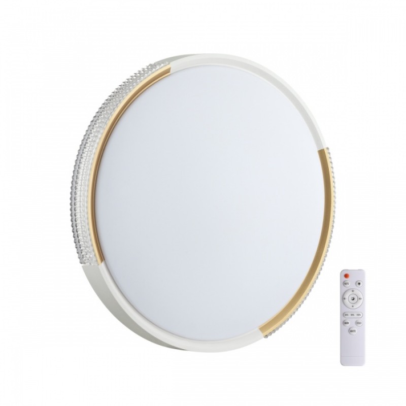 Светильник 7612/DL линии VELIO состоит из металлического основания (базы) и пластикового рассеивателя. Материал рассеивателя - качественный акрил белого цвета с матовой поверхностью, без текстуры. Пластик обеспечивает светильнику равномерное рассеивание и хорошее светопропускание. Форма плафона: круглая, декорирована ободом из пластика "под хрусталь" с золотистым элементом декора. Степень защиты IP43 позволяет использовать светильник в определенных зонах влажных помещений. В комплект входит заменяемый LED модуль с линзами, мощностью 48Вт, которая соответствует лампе накаливания 350Вт. А также пульт ДУ, с помощью которого осуществляется плавное изменение цветовой температуры 3000-6000К, изменение яркости, переход в режим переключения теплого/белого/холодного/ночного света. Светильник имеет функцию "память".