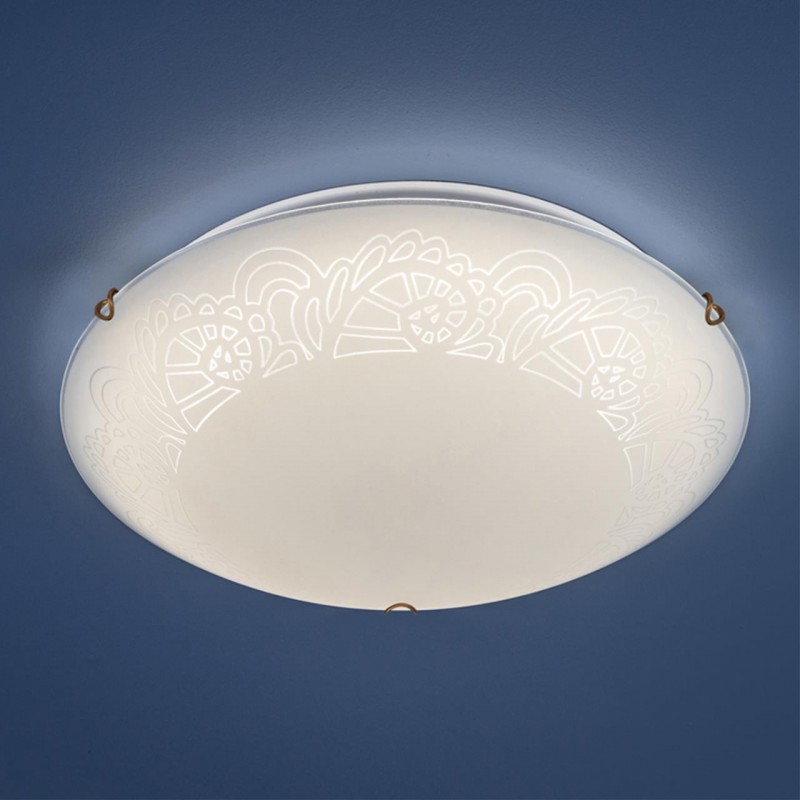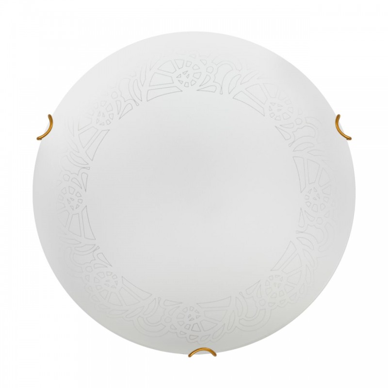 Светильник 7602/DL линии AMMONITE состоит из металлического основания (базы) и декорированного плафона. Материал плафона - стекло белого цвета с матовой поверхностью, обеспечивающее светильнику равномерное рассеивание и хорошее светопропускание. Форма плафона: круглая, декорирована прозрачным рисунком и клипсами цвета золото. В комплект входит заменяемый LED модуль с линзами, мощностью 48Вт, которая соответствует лампе накаливания 350Вт. Источник света имеет комфортную цветовую температуру 4000К (естественный белый, дневной свет).