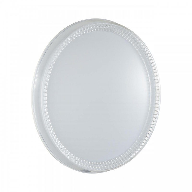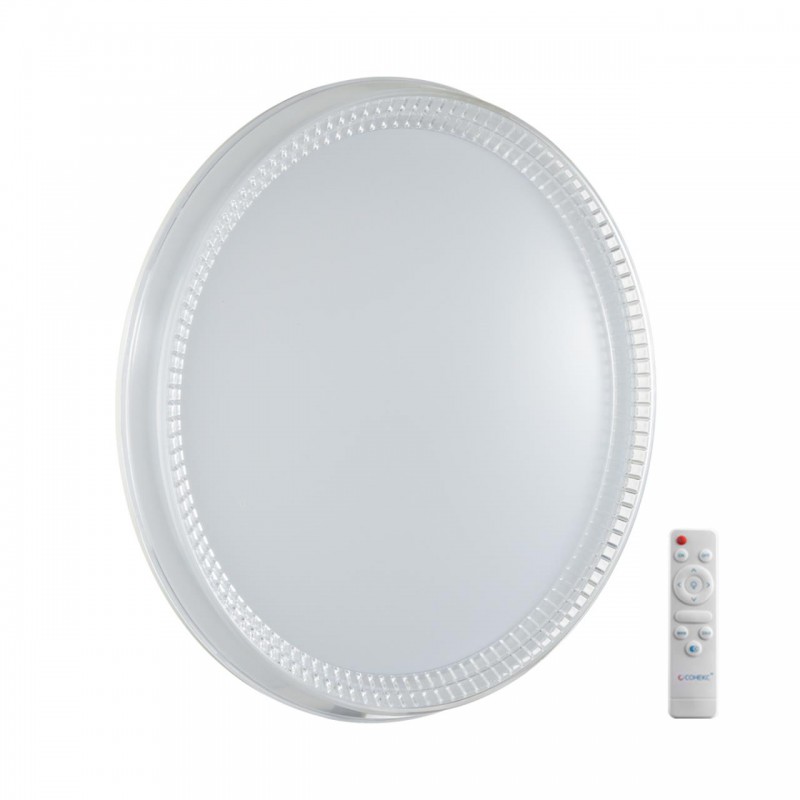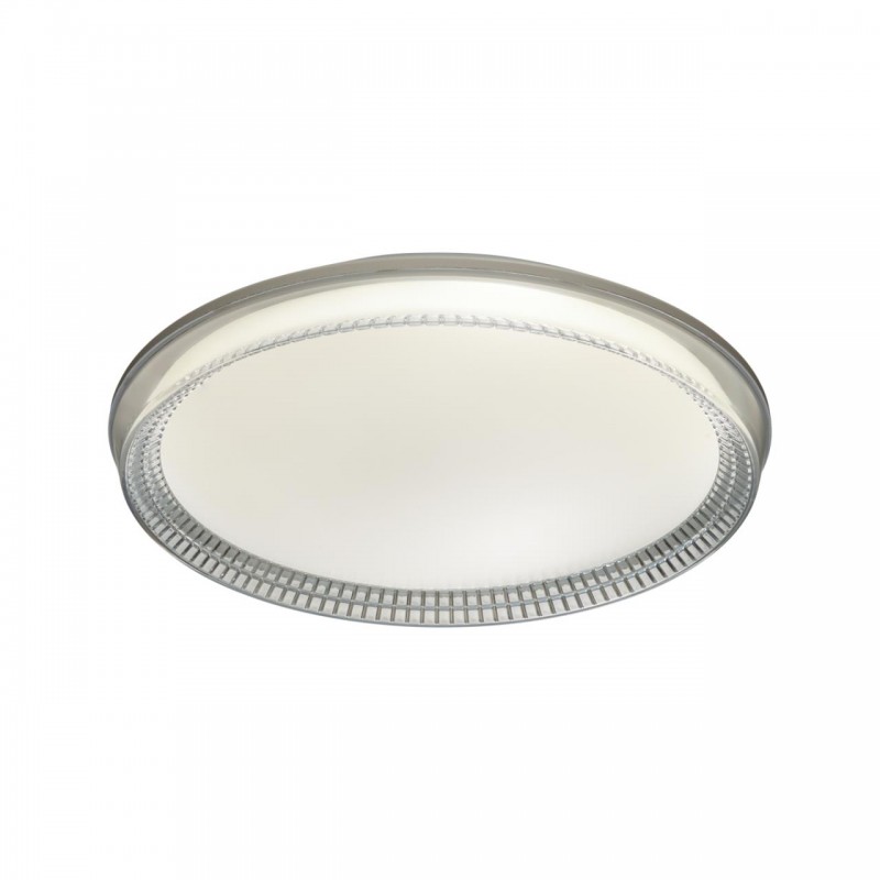 Светильник 7643/EL линии DEPAX состоит из металлического основания (базы) и пластикового рассеивателя. Материал рассеивателя - высококачественный пластик марки PMMA 2.0 белого цвета с гладкой матовой поверхностью, обеспечивающий светильнику равномерное рассеивание и хорошее светопропускание. Форма плафона: круглая, декорирована рельефным ободом из пластика прозрачного цвета. Благодаря прозрачному ободу светильник имеет увеличенный угол рассеивания света. Степень защиты IP43 позволяет использовать светильник в определенных зонах влажных помещений. В комплект входит заменяемый LED модуль с линзами, мощностью 70Вт, которая соответствует лампе накаливания 610Вт. А также пульт ДУ (с креплением на стену), с помощью которого осуществляется плавное изменение цветовой температуры 3000-6000К, изменение яркости, переход в режим переключения теплого/белого/холодного/ночного света. Светильник имеет функцию "память".