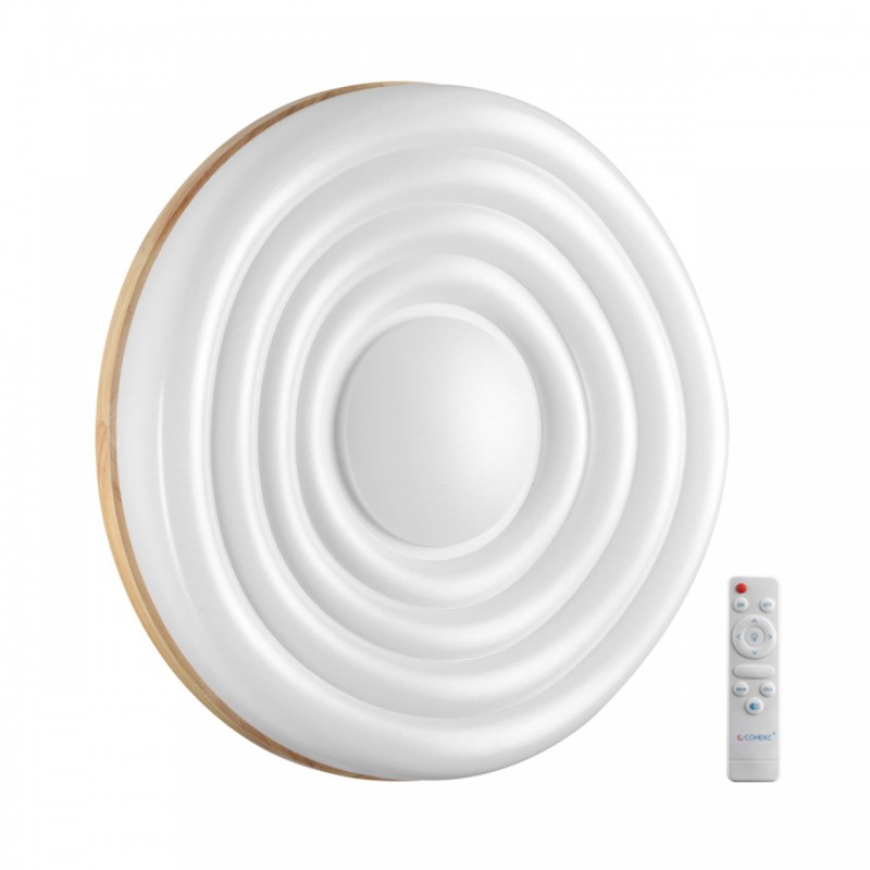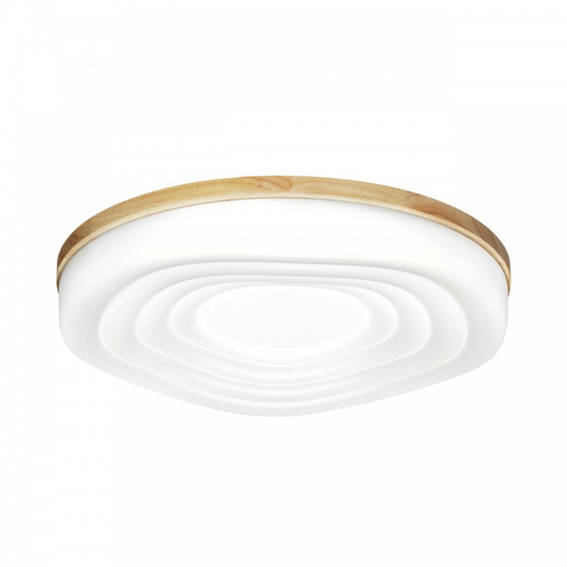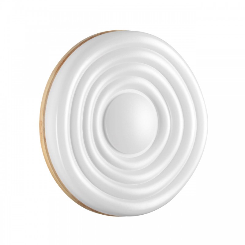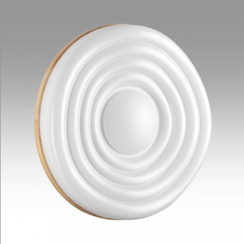 Светильник 7674/EL линии FASS WOOD состоит из металлического основания (базы) и пластикового рассеивателя. Материал рассеивателя - высококачественный пластик марки PMMA 2.0 белого цвета с глянцевой поверхностью и рельефной структурой. Пластик обеспечивает светильнику равномерное рассеивание и хорошее светопропускание. Форма плафона: круглая, декорирована ободом из натурального дерева. Степень защиты IP43 позволяет использовать светильник в определенных зонах влажных помещений. В комплект входит заменяемый LED модуль с линзами, мощностью 70Вт, которая соответствует лампе накаливания 610Вт. А также пульт ДУ (с креплением на стену), с помощью которого осуществляется плавное изменение цветовой температуры 3000-6000К, изменение яркости, переход в режим переключения теплого/белого/холодного/ночного света. Светильник имеет функцию "память".