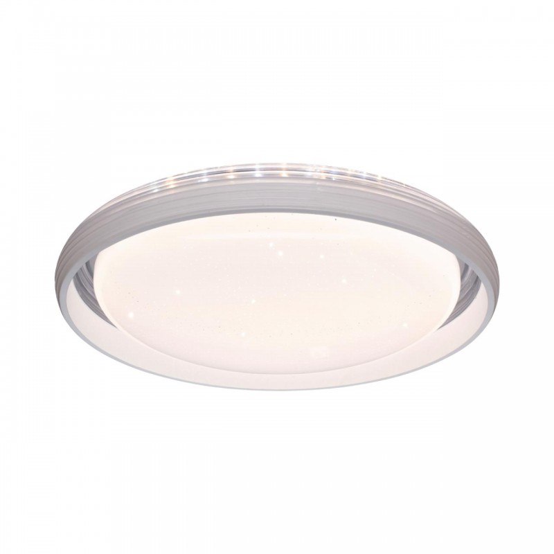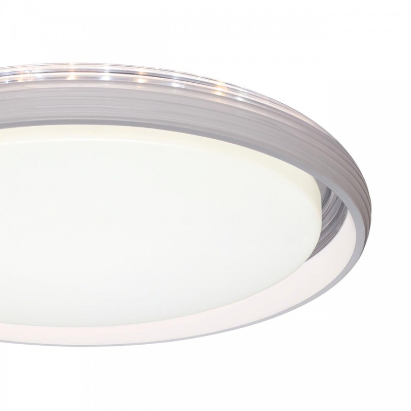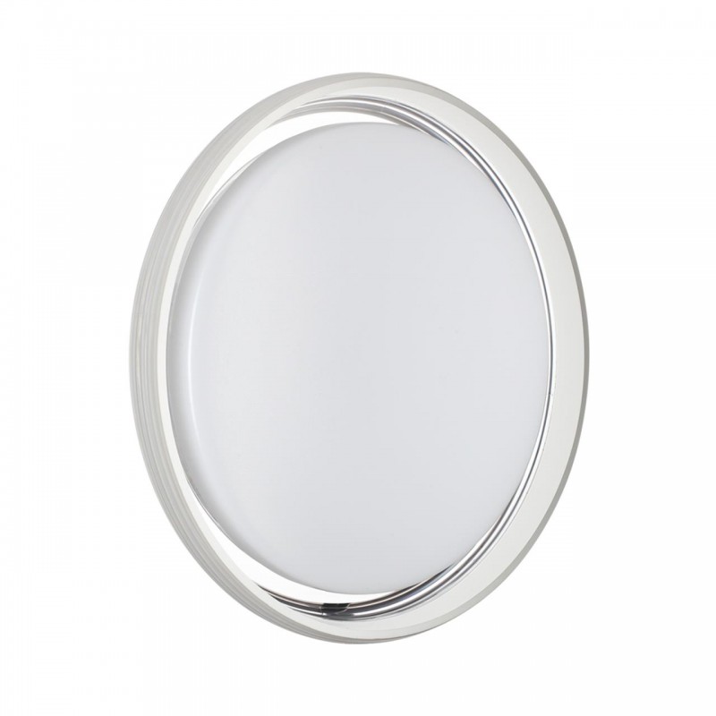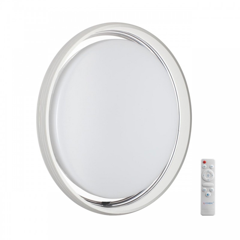 Светильник 7697/EL линии HANI состоит из металлического основания (базы) и пластикового рассеивателя. Материал рассеивателя - высококачественный пластик марки PMMA 2.0 белого цвета с глянцевой поверхностью, без текстуры. Пластик обеспечивает светильнику равномерное рассеивание и хорошее светопропускание. Форма плафона: круглая, декорирована многослойным ободом из пластика белого цвета у края плафона и прозрачного цвета у его основания. Степень защиты IP43 позволяет использовать светильник в определенных зонах влажных помещений. В комплект входит заменяемый LED модуль с линзами, мощностью 70Вт, которая соответствует лампе накаливания 610Вт. А также пульт ДУ (с креплением на стену), с помощью которого осуществляется плавное изменение цветовой температуры 3000-6000К, изменение яркости, переход в режим переключения теплого/белого/холодного/ночного света. Светильник имеет функцию "память".