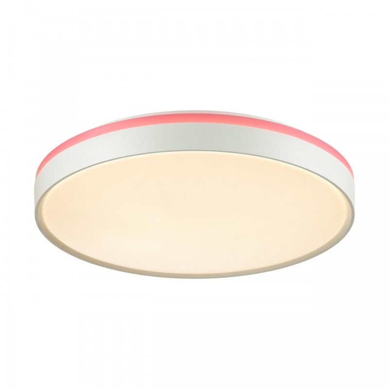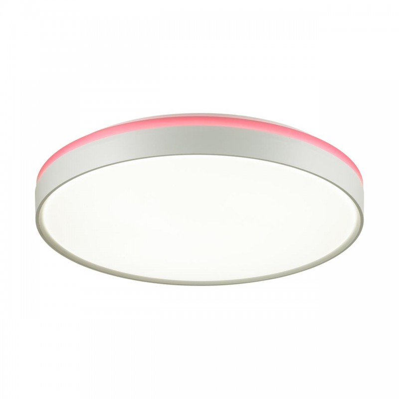 Светильник 7708/EL линии KEZO PINK состоит из металлического основания (базы) и пластикового рассеивателя. Материал рассеивателя - высококачественный пластик марки PMMA 2.0 белого цвета с матовой поверхностью, без текстуры. Пластик обеспечивает светильнику равномерное рассеивание и хорошее светопропускание. Форма плафона: круглая, декорирована белым ободом со светопропускающей вставкой розового цвета у его основания. Степень защиты IP43 позволяет использовать светильник в определенных зонах влажных помещений. В комплект входит заменяемый LED модуль с линзами, мощностью 70Вт, которая соответствует лампе накаливания 610Вт. А также пульт ДУ (с креплением на стену), с помощью которого осуществляется плавное изменение цветовой температуры 3000-6000К, изменение яркости, переход в режим переключения теплого/белого/холодного/ночного света. Светильник имеет функцию "память".