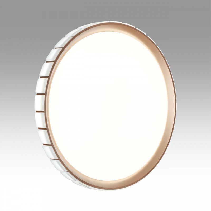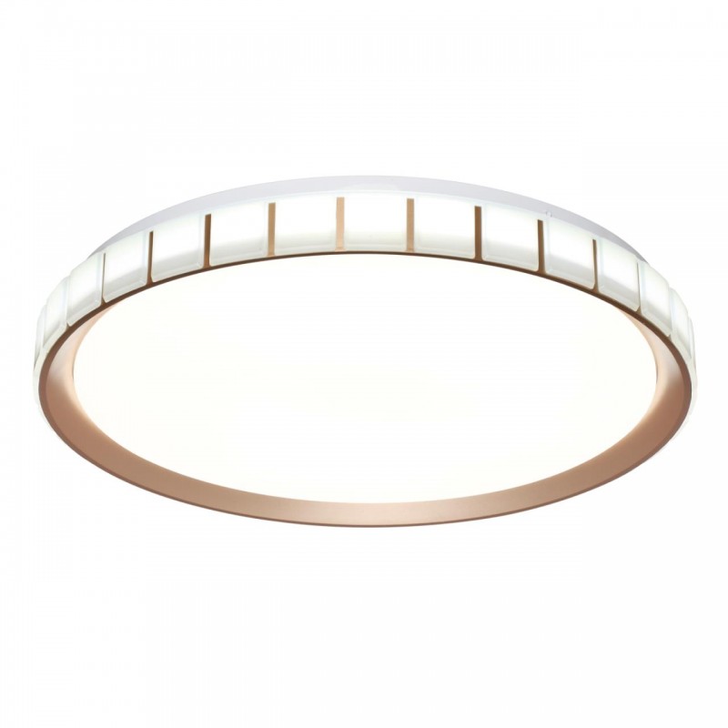 Светильник 7695/EL линии KUPI GOLD состоит из металлического основания (базы) и пластикового рассеивателя. Материал рассеивателя - высококачественный пластик марки PMMA 2.0 белого цвета с матовой, гладкой поверхностью. Пластик обеспечивает светильнику равномерное рассеивание и хорошее светопропускание. Форма плафона: круглая, декорирована рельефным пластиковым светопропускающим ободом, цвет розовое золото. Степень защиты IP43 позволяет использовать светильник в определенных зонах влажных помещений. В комплект входит заменяемый LED модуль с линзами, мощностью 70Вт, которая соответствует лампе накаливания 610Вт. А также пульт ДУ (с креплением на стену), с помощью которого осуществляется плавное изменение цветовой температуры 3000-6000К, изменение яркости, переход в режим переключения теплого/белого/холодного/ночного света. Светильник имеет функцию "память".