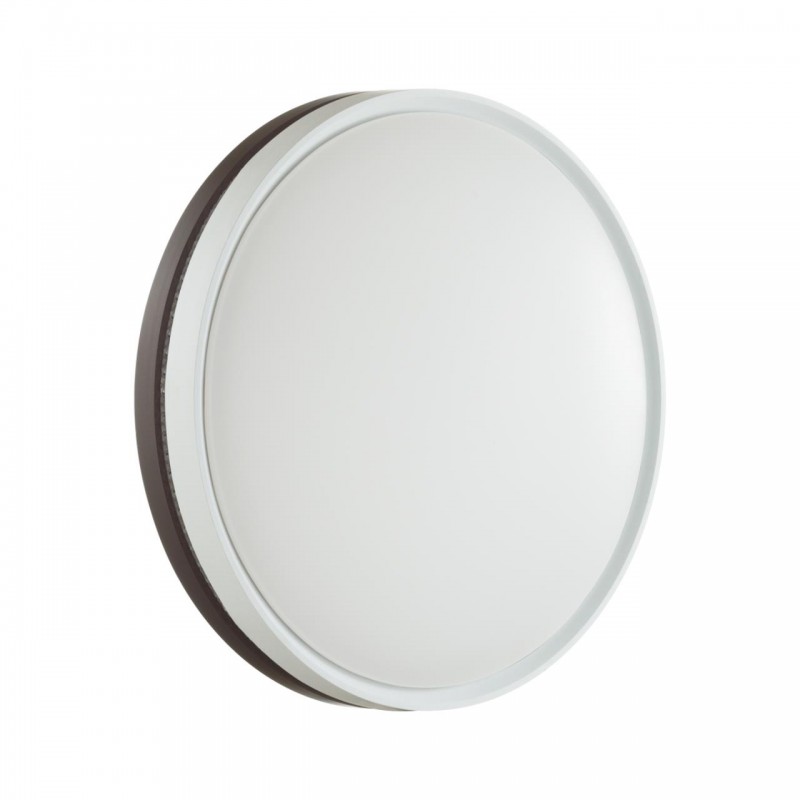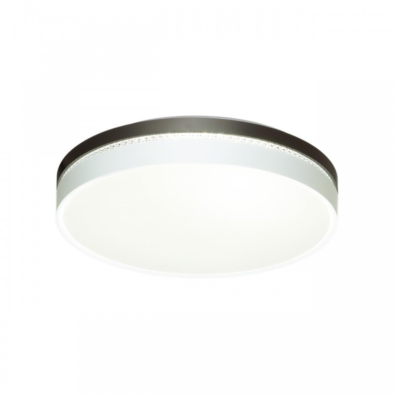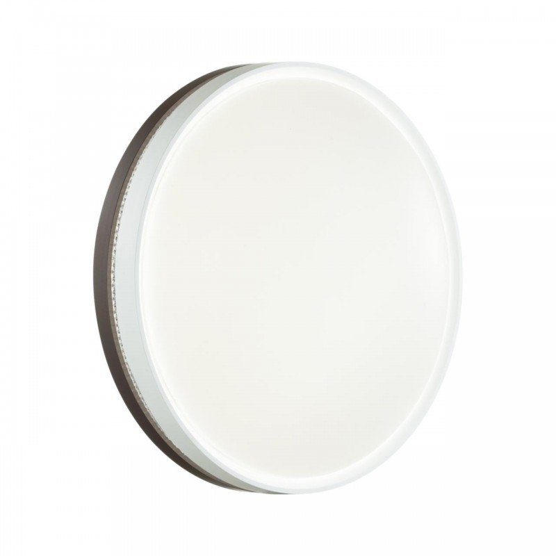 Светильник 7668/DL линии NOHAVA BROWN состоит из металлического основания (базы) и пластикового рассеивателя. Материал рассеивателя - высококачественный пластик марки PMMA 2.0 белого цвета с матовой поверхностью. Пластик обеспечивает светильнику равномерное рассеивание и хорошее светопропускание. Форма плафона: круглая, декорирована ободом из пластика темно-коричневого цвета у основания светильники и белого цвета у внешнего края. Обод украшен прозрачной декоративной вставкой "под хрусталь". Степень защиты IP43 позволяет использовать светильник в определенных зонах влажных помещений. В комплект входит заменяемый LED модуль с линзами, мощностью 48Вт, которая соответствует лампе накаливания 460Вт. Источник света имеет комфортную цветовую температуру 4000К (белый свет).