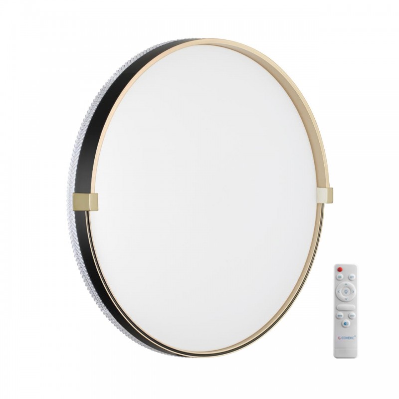 Светильник 7647/EL линии OLIDI BLACK состоит из металлического основания (базы) и пластикового рассеивателя. Материал рассеивателя - высококачественный пластик марки PMMA 2.0 белого цвета с матовой поверхностью, без текстуры. Пластик обеспечивает светильнику равномерное рассеивание и хорошее светопропускание. Форма плафона: круглая, декорирована ободом из пластика черного и золотистого цветов с прозрачной вставкой под хрусталь. Обод украшен металлическими клипсами, цвет золото. Степень защиты IP43 позволяет использовать светильник в определенных зонах влажных помещений. В комплект входит заменяемый LED модуль с линзами, мощностью 70Вт, которая соответствует лампе накаливания 610Вт. А также пульт ДУ (с креплением на стену), с помощью которого осуществляется плавное изменение цветовой температуры 3000-6000К, изменение яркости, переход в режим переключения теплого/белого/холодного/ночного света. Светильник имеет функцию "память".