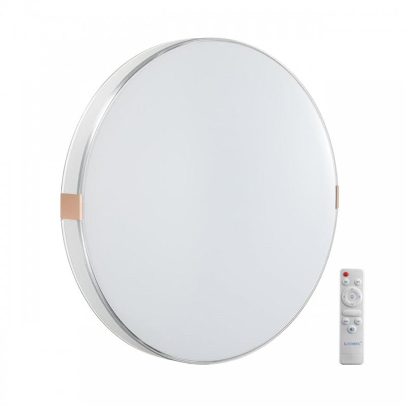 Светильник 7676/EL линии OTIGA WHITE состоит из металлического основания (базы) и пластикового рассеивателя. Материал рассеивателя - высококачественный пластик марки PMMA 2.0 белого цвета с матовой поверхностью, без текстуры. Пластик обеспечивает светильнику равномерное рассеивание и хорошее светопропускание. Форма плафона: круглая, с ободом из прозрачного пластика, декорированного эко кожей белого цвета. Обод украшен металлическими клипсами, цвет золото. Степень защиты IP43 позволяет использовать светильник в определенных зонах влажных помещений. В комплект входит заменяемый LED модуль с линзами, мощностью 70Вт, которая соответствует лампе накаливания 610Вт. А также пульт ДУ (с креплением на стену), с помощью которого осуществляется плавное изменение цветовой температуры 3000-6000К, изменение яркости, переход в режим переключения теплого/белого/холодного/ночного света. Светильник имеет функцию "память".