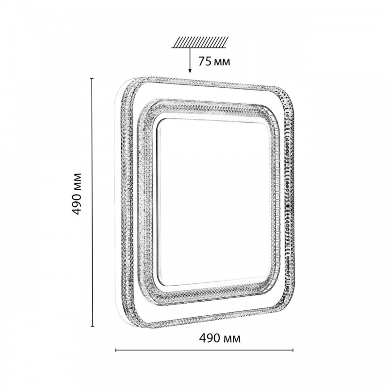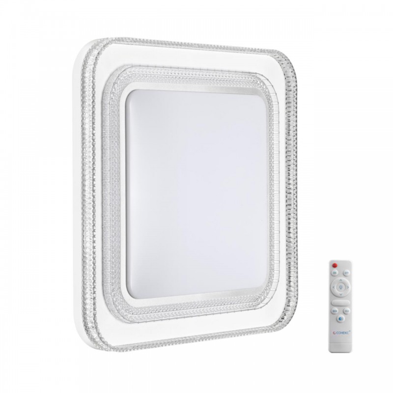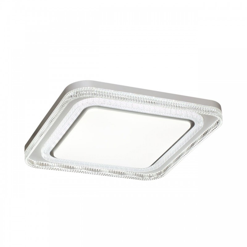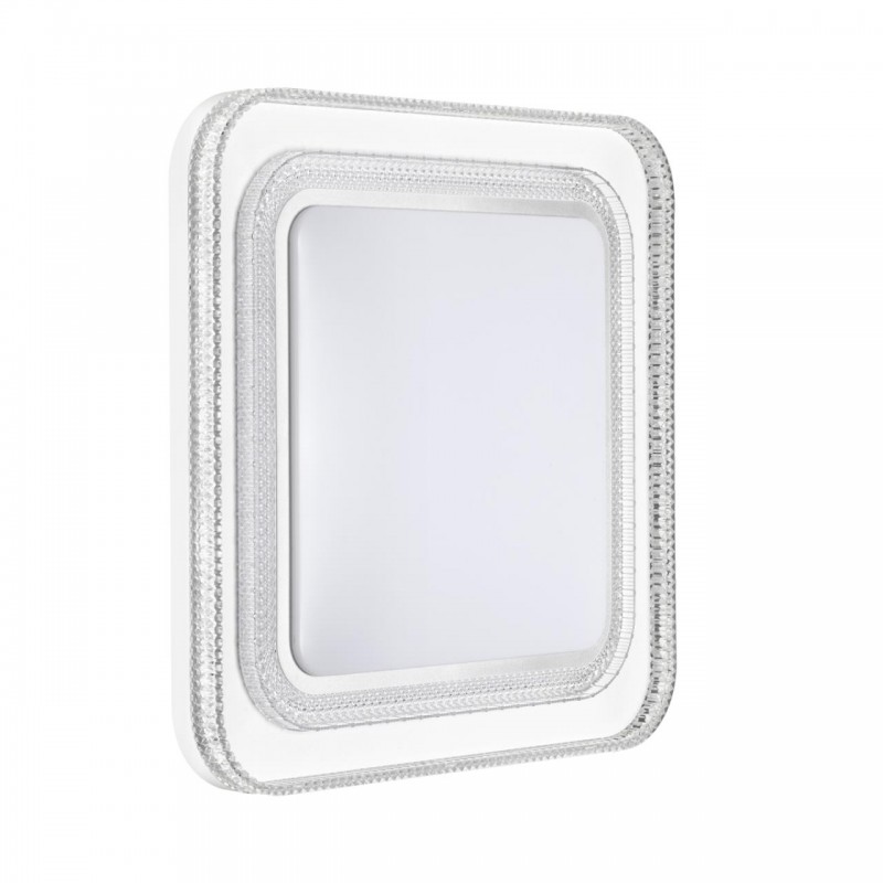 Светильник 7685/EL линии SUZY SILVER состоит из металлического основания (базы) и пластикового рассеивателя. Материал рассеивателя - высококачественный пластик марки PMMA 2.0 белого цвета с матовой поверхностью, без текстуры. Пластик обеспечивает светильнику равномерное рассеивание и хорошее светопропускание. Форма плафона: квадратная, декорирована двойным прозрачным ободом "под хрусталь" из пластика прозрачного цвета. Обод украшен пластиковым кантом, цвет серебро. Степень защиты IP43 позволяет использовать светильник в определенных зонах влажных помещений. В комплект входит заменяемый LED модуль с линзами, мощностью 70Вт, которая соответствует лампе накаливания 610Вт. А также пульт ДУ (с креплением на стену), с помощью которого осуществляется плавное изменение цветовой температуры 3000-6000К, изменение яркости, переход в режим переключения теплого/белого/холодного/ночного света. Светильник имеет функцию "память".