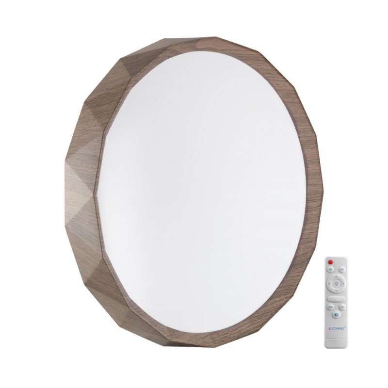Светильник 7637/EL линии ZIF WOOD состоит из металлического основания (базы) и пластикового рассеивателя. Материал рассеивателя - высококачественный пластик марки PMMA 2.0 белого цвета с матовой поверхностью, обеспечивающий светильнику равномерное рассеивание и хорошее светопропускание. Форма плафона: круглая, декорирована ободом "под дерево" из пластика коричневого цвета. Степень защиты IP43 позволяет использовать светильник в определенных зонах влажных помещений. В комплект входит заменяемый LED модуль с линзами, мощностью 70Вт, которая соответствует лампе накаливания 610Вт. А также пульт ДУ (с креплением на стену), с помощью которого осуществляется плавное изменение цветовой температуры 3000-6000К, изменение яркости, переход в режим переключения теплого/белого/холодного/ночного света. Светильник имеет функцию "память".