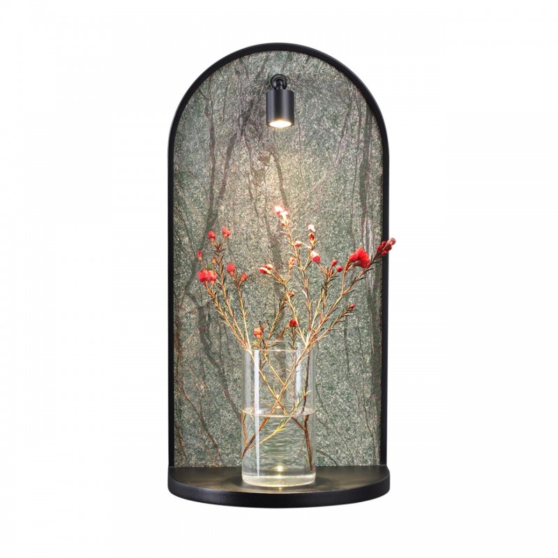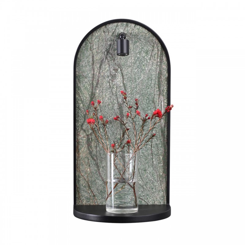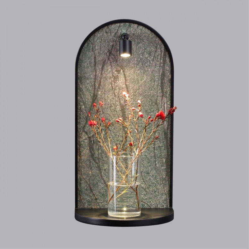 Светильник-полка Giardino был вдохновлен видом окна в сад, благоухающим цветами и запахом мокрой листвы. Декор выполнен из каменного шпона, прожилки которого напоминают силуэт деревьев. Полка и обрамление каменного шпона - в черном цвете. Полка выдерживает до 6 кг. Выключатель расположен под полкой. Спот вращается на градусов и при необходимости может быть повернут наверх.Угол рассеивания спота - 24°, угол вращения спота - 90/350°.
