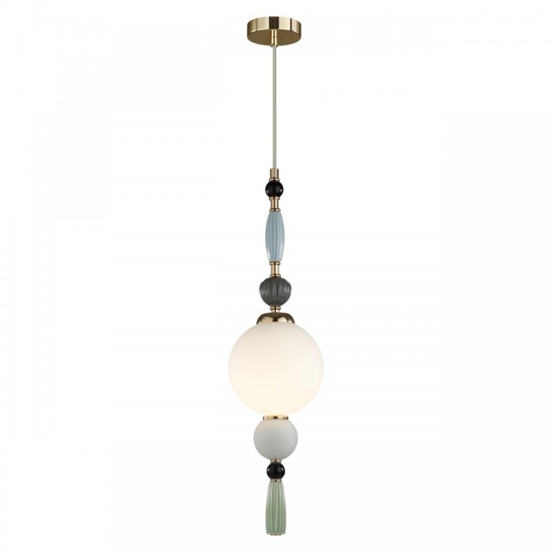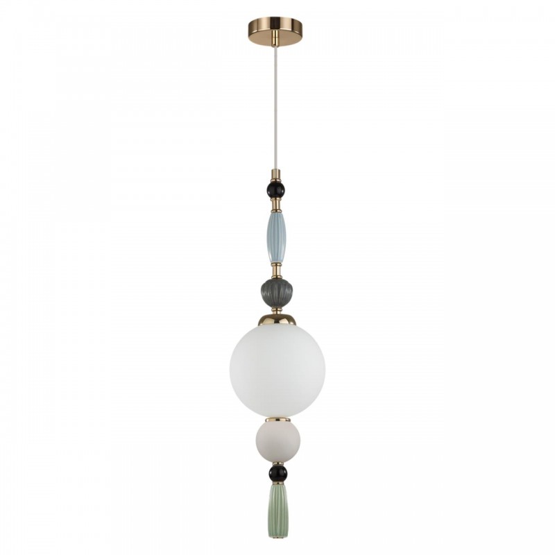 Воздушная линия светильников Palle декорирована керамикой ручной работы. В ней красиво сочетаются гофрированная керамика, металл покрытый золотой гальваникой и матовое белое стекло. Керамический декор выполнен в серых оттенках с акцентной светло-зеленой кисточкой и дополнен стеклянными черными бусинами. Подвесы и люстры имеют возможность регулировки высоты благодаря наборной штанге.