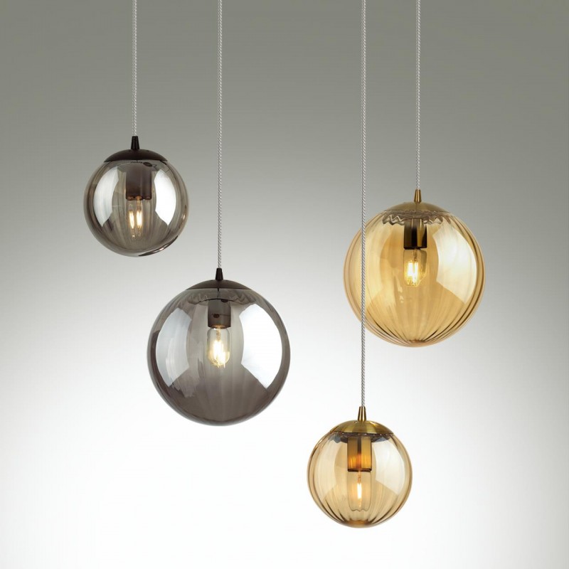 Серия KATA – подвесы сферической формы в необыкновенно красивой цветовой гамме - дымчатой и янтарной - с едва заметными вертикальными полосками, которые за счет голографического эффекта придают плафонам особую эстетику. Особенно эффектно подвесы будут смотреться в композиции из большого и малого размера, а также в миксе дымчатого и янтарного.