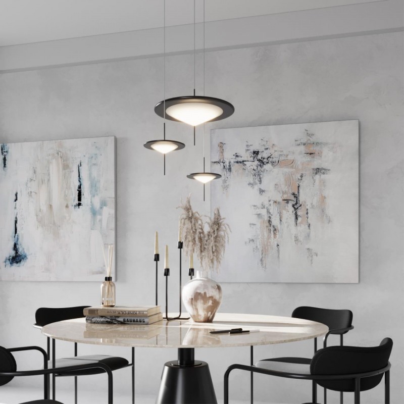 Элегантность и утонченность в подвесах — это линия Steka. Словно стилизованные светящиеся японские зонтики — так выглядит композиция из больших и малых светильников в интерьере. Трендовый черный матовый цвет арматуры подчеркивает минимализм моделей. Матовый акриловый рассеиватель мягко пропускает светодиодный свет. Подвесы идеально будут смотреться в интерьерах в стиле минимализм, модерн, хайтек.