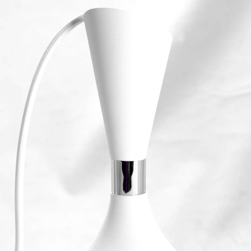 Белый небольшой подвес выполнен из металла, с возможностью изменения высоты подвеса, оснащен цоколем Е27 для применения ламп с высокой светоотдачей. Приталенная форма подвеса не имеет вертикальной симметрии, вверх от талии меньше, а низ больше, также на так называемой талии разместился и так называемый пояс бронзового цвета.