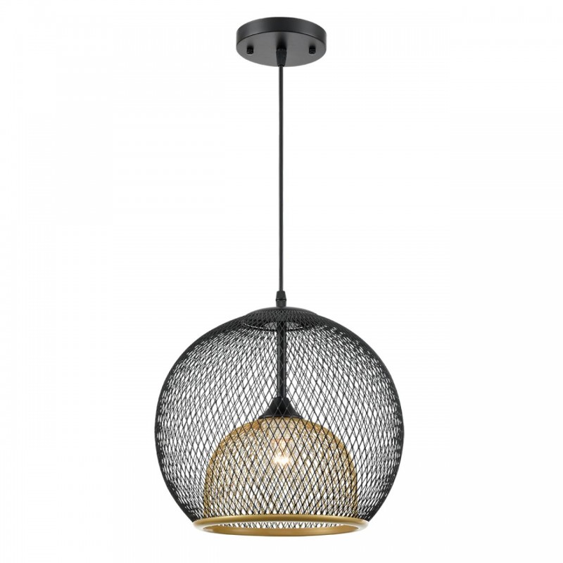 Подвесной светильник LEONELA в стиле лофт интересен двойным плафоном из сетки: черный снаружи и золотой внутри. Блеск желтого металла усиливается от света включенной лампы, при этом черная вуаль второго большого полукруглого абажура усмиряет и приглушает излишнюю яркость позолоты. Металлический полупрозрачный абажур не сильно скрадывает свет, наполняя комнату уютным освещением.