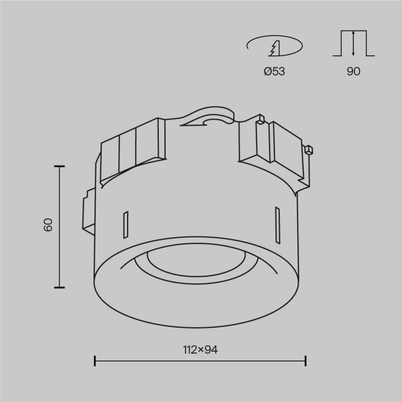 Предназначен для установки в натяжной ПВХ потолок. Состоит из основания, термокольца и цоколя GX53. Основание и цоколь выполнены из термостойкого и ударопрочного АВС пластика. Монтаж производится методом втяжки. Конструкция светильника позволяет легко стыковать между собой несколько оснований, благодаря чему можно создавать комбинации из нескольких светильников.